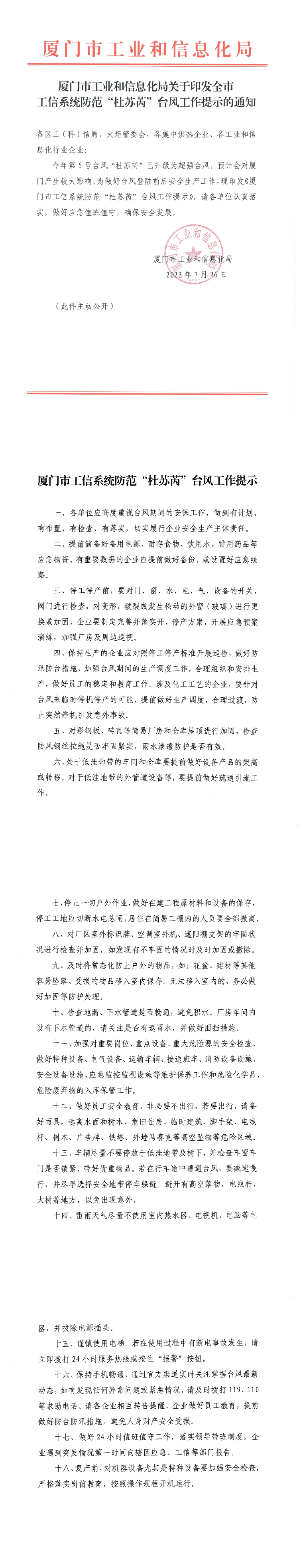 厦门市工业和信息化局关于印发全市工信系统防范“杜苏芮”台风工作提示的通知