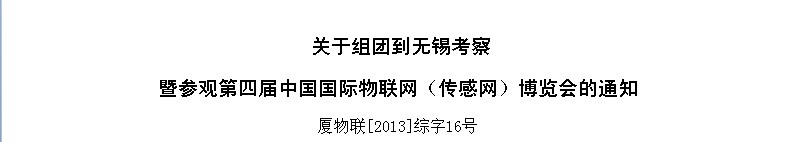 为促进厦门市物联网行业的发展,加强与外省市物联网行业的合作交流,以及开展厦门市软件园三期物联网产业园区对外省企业的招商工作。本会将组织企业组团到无锡考察;时间:2013年9月25--28日