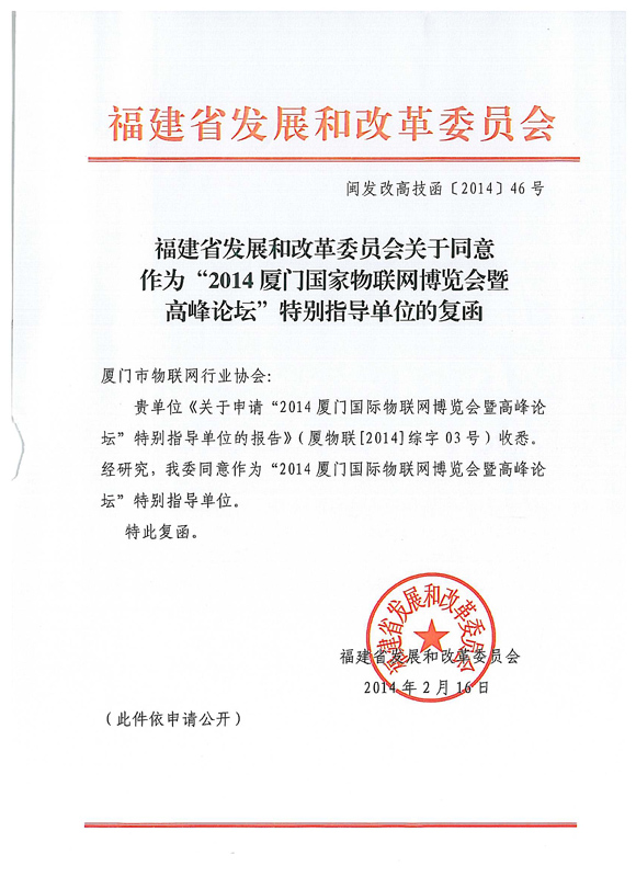 福建省发展和改革委员会关于同意作为“2014厦门国际物联网博览会暨高峰论坛”特别指导单位的复函