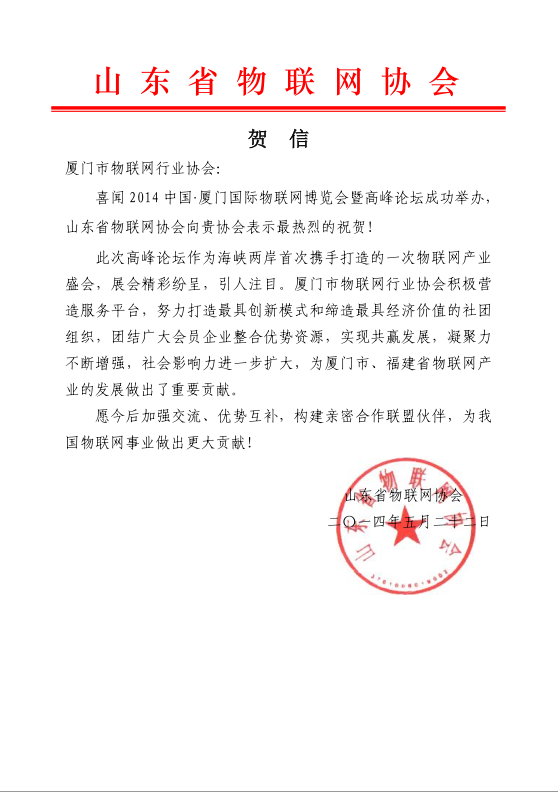 山东省物联网协会发来贺信祝贺我协会博览会成功举办