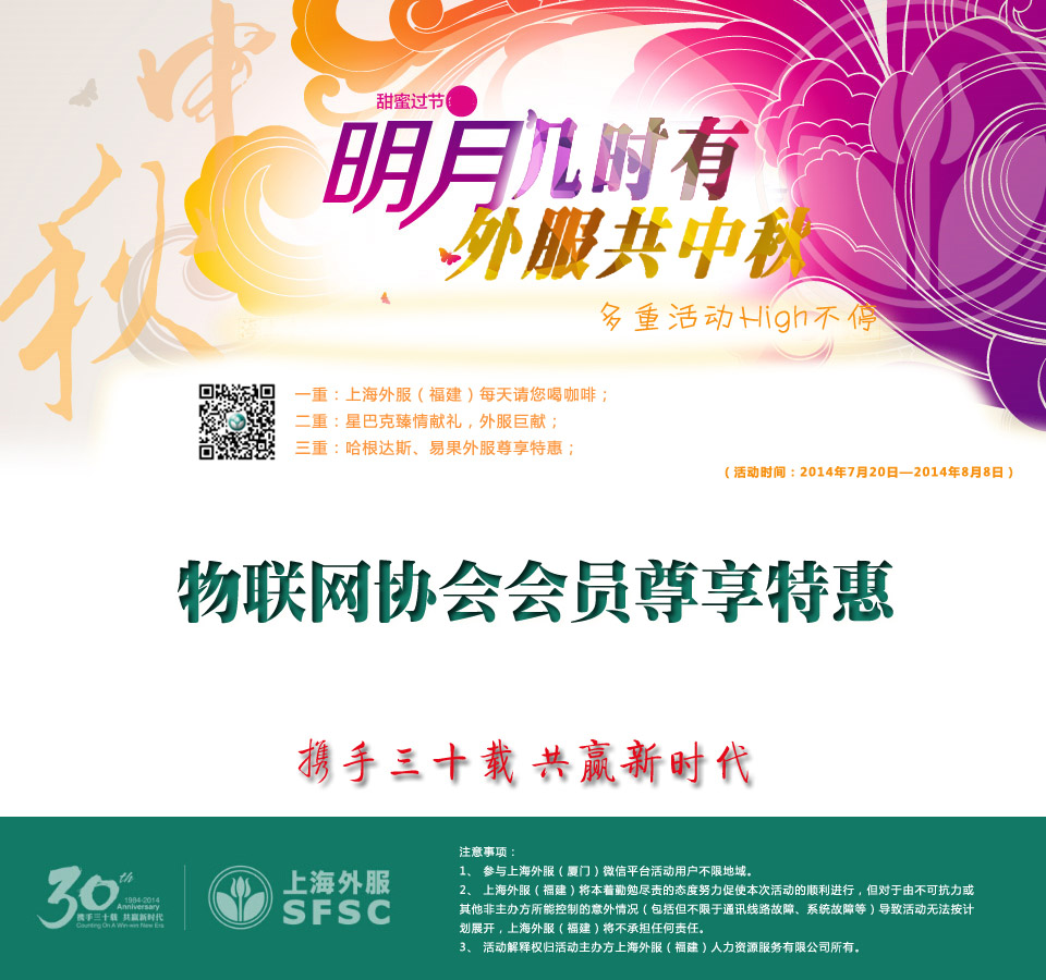 上海外服(福建)推出物联网协会会员尊享特惠,凡我协会会员向上海外服购买中秋弹性福利产品(星巴克、哈根达斯等)均可享受外服专享特惠。