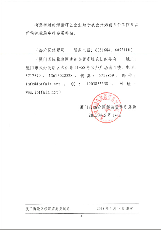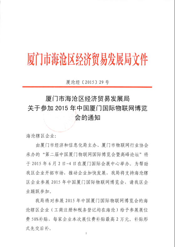 为帮助海沧区企业开拓市场,推动企业加快发展,海沧区经济贸易发展局将支持海沧辖区企业参展2015厦门国际物联网博览会,对海沧辖区企业(工商注册和税务登记均在海沧)给予参展展位50%补贴,每家企业本次展位费补贴最高2万元。补贴形式先交后补。