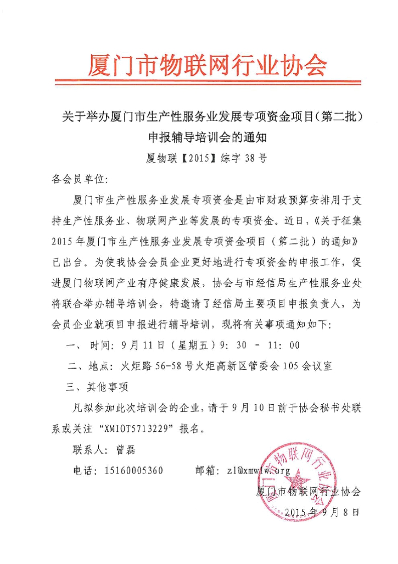 厦门市生产性服务业发展专项资金是由市财政预算安排用于支持生产性服务业、物联网产业等发展的专项资金。近日,《关于征集2015年厦门市生产性服务业发展专项资金项目(第二批)的通知》已出台。为使我协会会员企业更好地进行专项资金的申报工作,促进厦门物联网产业有序健康发展,协会与市经信局生产性服务业处将联合举办辅导培训会,特邀请了经信局主要项目申报负责人,为会员企业就项目申报进行辅导培训,现将有关事项通知如下: