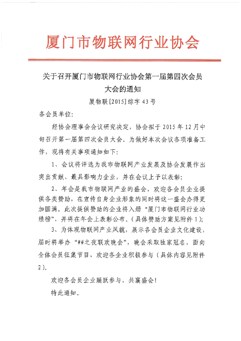 关于召开厦门市物联网行业协会第一届第四次会员大会的通知