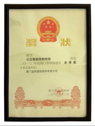 蓝斯股份“公交智能信息终端”项目凭借先进强大的软硬件平台,智能人性化的裁剪、组合技术,根据不同行业应用需求设计多样化的产品形态,从而满足适应不同市场需求。该项目已应用于厦门及海峡西岸各城市应用示范,并已将成功案例复制推广到国内外50多个城市,为智慧城市、公交都市建设作出应有的贡献,并取得显著的经济效益和社会效益。经过专家多轮评审和市奖励委员会表决,被评选为2013年度厦门市科技进步三等奖。