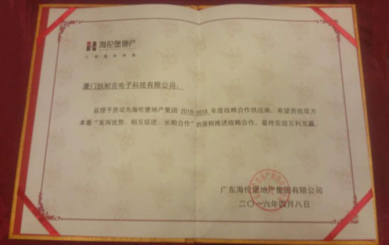 2016年4月8日厦门狄耐克电子科技有限公司应邀参加海伦堡地产集团2016年供应商大会,会上,狄耐克正式与海伦堡地产签订战略合作协议,成为海伦堡地产楼宇对讲战略集采供应商合作伙伴。