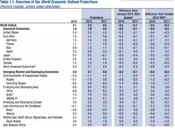 IMF下调2016年全球经济增速预期从3.4%至3.2%,2017年全球增速预期从3.6%至3.5%。并上调2016年中国经济增速预估,从6.3%上调至6.5%。