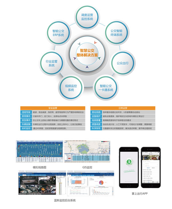 智慧交通整体解决方案通过北斗卫星定位系统、4G网络、电子地图、传感器、视频技术等多个跨学科技术应用,推动城市公共交通管理规范化、运行监管自动化、决策支持科学化、运营调度合理化、信息服务一体化,提高城市公共交通运输服务与监管水平,全面提高城市公共交通效能,给广大市民提供优质公共服务。