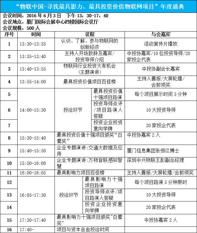借助物联网博览会在业界的声誉,由新华网、厦门市会议展览事务局、厦门市物联网行业协会、厦门市物联网产业研究院携手新华社、工信部、住建部、中科院、中国工程院、中国互联网行业协会、中国投资行业协会等多家部门及单位资源,共同发起主办的2016“物联中国——寻找最具影响力、最具投资价值物联网项目”年度盛典活动将与物联网博览会同期举行,活动面向全国及台湾、香港地区通过海选的方式招募最具影响力、最具投资价值的物联网项目,并由著名专家学者、知名投资人组成“物联中国”项目评审委员会对招募项目进行严格科学评审,分别产生“最具影响力百佳十强物联网项目”和“最具投资价值百佳十强物联网项目”。活动组委会还组织专注于物联网项目投资和项目引进的物联网大企业、中国投资机构与会,为前来参会的优秀物联网项目提供亿万风投资金对接,向市场推荐最具影响力的产业项目并发掘具有投资价值和成长前景的物联网项目和团队,年度盛典活动将成为企业引进技术、人才的重要窗口,为各级政府引进境内外项目搭建重要的招商平台。