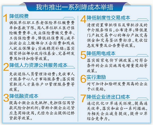 近日,国务院发布降低实体经济企业成本工作方案的通知,目标任务是3年左右使实体经济企业综合成本合理下降,盈利能力较为明显增强。记者了解到,降成本方面,厦门市正打出“组合拳”,力争将厦门市打造成为“全国企业经营成本最低、营商环境最优的城市”。
