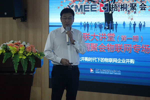 图二:肖宁老师以“大并购时代下的物联网企业发展”为主题作了精彩的演讲,为与会企业代表深入分析了如何在大并购时代下,实现物联网企业的突围,企业怎样抓住并购潮涌现的资本机遇,帮助自己做大做强。肖宁指出,并购是产业与资本的结合,物联网企业天然的需要构建企业之间的联系,从资本的角度缩短技术落地的时间,通过并购实现弯道超车。