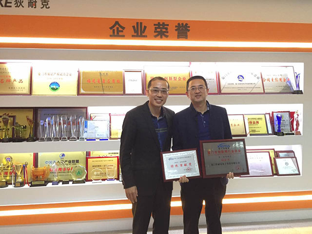 厦门狄耐克电子科技有限公司总经理缪国栋(右)接受特殊贡献奖牌匾,并与协会执行秘书长朱光辉合影留念