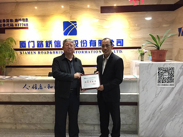 厦门路桥信息股份有限公司总经理于征(左)接受特殊贡献奖牌匾,并与协会执行秘书长朱光辉合影留念