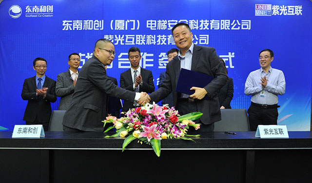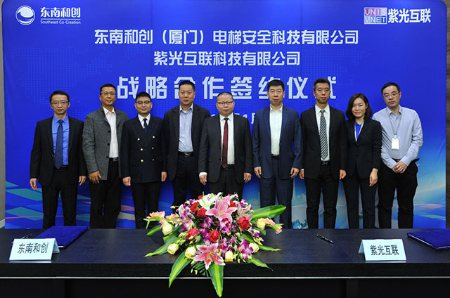 2017年1月12日,紫光互联科技有限公司(以下简称紫光互联)和东南和创(厦门)电梯安全科技有限公司(以下简称东南和创)签署战略合作框架协议,双方将在东南和创原有电梯物联网公共服务平台基础上全面合作升级,打造基于云计算、大数据和物联网等技术的智慧电梯、智慧社区的综合解决方案。紫光股份副总裁兼紫光互联董事丁磊,紫光互联首席执行官周群,紫光互联技术副总裁顾冉,紫光互联市场部总经理李昕昭,东南和创董事长陈瑞品,东南和创股东、北京运通汇金投资管理有限公司董事长刘峰,东南和创董事张伟军,东南和创董事丁志明,东南和创股东、合伙创始人曹煦晖出席了此次签约仪式。