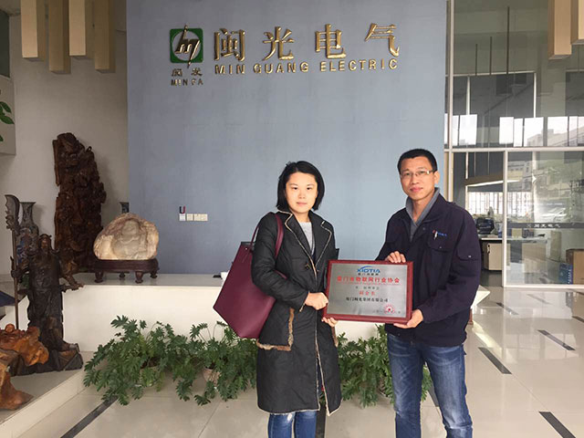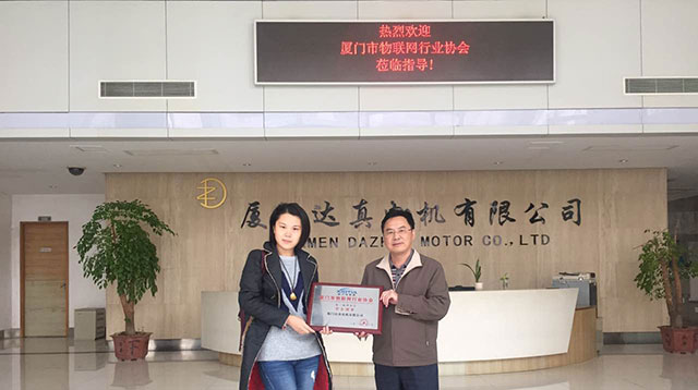 走访常务理事单位厦门达真电机有限公司,图为达真电机公司总经理陈红岩(图右)与秘书处工作人员合影