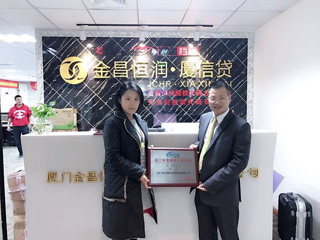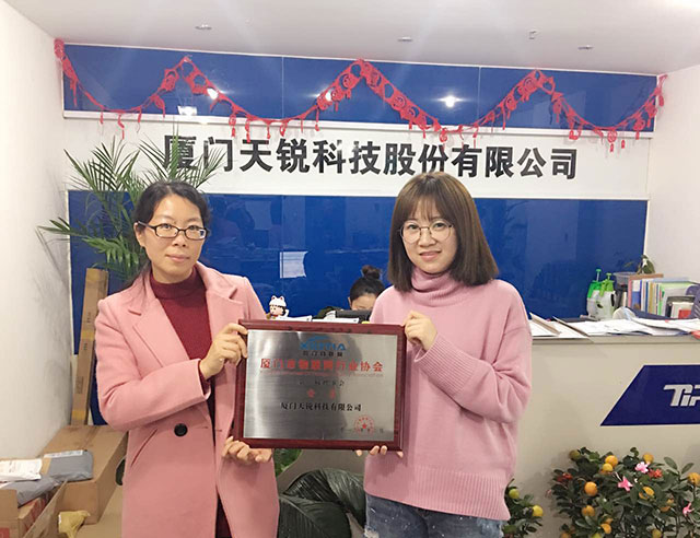 走访会员单位厦门天锐科技股份有限公司,图为天锐科技董秘张艳蓉(图左)与协会秘书处工作人员合影
