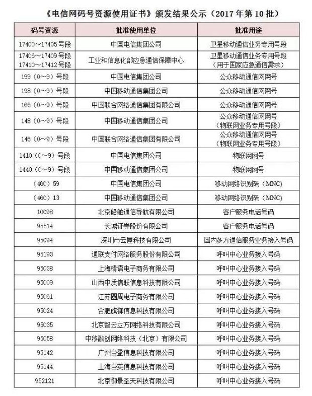 据工业和信息化部网站发布的信息,工信部日前批准同意了部分单位提出的电信网码号资源有关申请,对2017年第10批《中华人民共和国电信网码号资源使用证书》颁发结果进行公示。