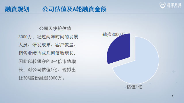 纬尔科技公司从成立至今已投入资金700万元,业务运转良好。公司天使轮估值3000万,经过两年时间的发展人员、研发成果、客户数量、销售业绩均成几何倍数增长,因此以较保守的3-4倍市值增长,对公司估值1亿。为抓住商机,加快发展速度,公司现拟出让30%股份融资3000万。